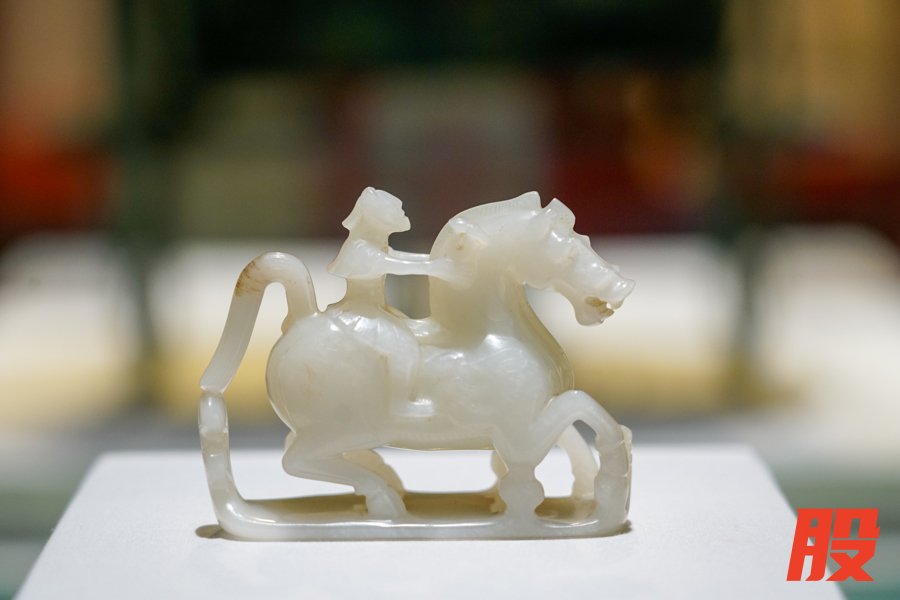 此次生肖展位于上博人民广场馆四楼的第三展厅,2月4日开展第一天,陈设在展厅入口处的白玉仙人奔马就引起大量观众围观拍照。这件玉雕以新疆和田羊脂白玉雕成,描绘一位羽衣仙人坐在飞马背上的形象,工艺精美,生动诠释了汉人“天马行空”的浪漫想象与“羽化登仙”的祈愿。有翼神兽在汉代信仰与艺术中广泛流行,人们视其为沟通天地的祥瑞象征。有趣的是,这件神马的底座背面还刻有浮云图案,让人想起曾经流行的网络梗——“神马都是浮云”。