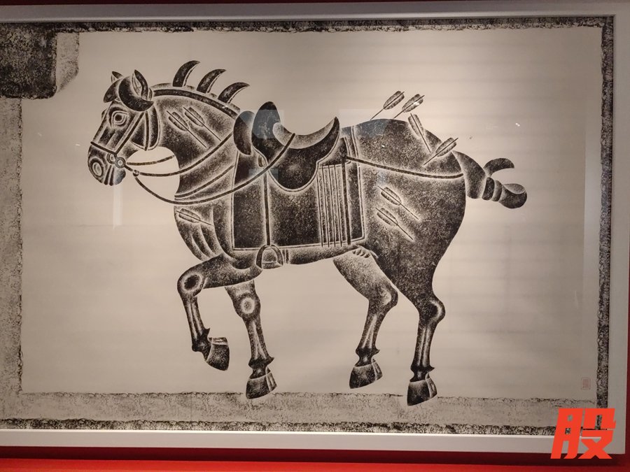 这六匹马跟随唐太宗征伐沙场,最后都不幸战亡。六幅拓印上的骏马图案大都负箭而行,比如青骓身中五箭仍呈现飞奔之姿,拳毛䯄身中九箭还在奋力前行,至今看来仍令人动容。除了驰骋沙场的战马,展览中也有安逸闲适之马。比如徐悲鸿《饮马图》就画了马站立饮水的状态,“徐悲鸿的奔马脍炙人口,但我们特地没有选奔马,而是饮水休息的马,也希望告诉大家,工作起来不要太‘牛马’、太拼,有时候还要休息一下,喝点水,补充能量。”褚馨笑着说。