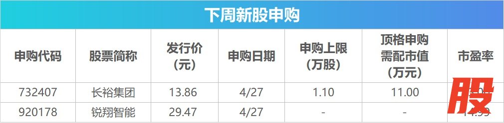 数据显示,下周将有2只新股发行,其中,沪市主板有1只,北交所有1只。4月27日发行的是长裕集团、锐翔智能。
