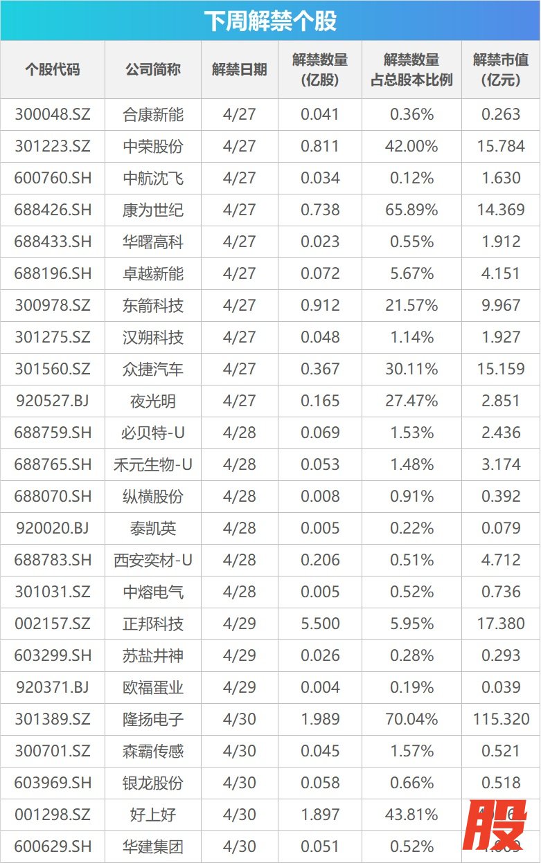 Wind数据统计显示,下周(4月27日-5月1日)共有24家公司限售股陆续解禁,合计解禁13.13亿股,按4月24日收盘价计算,解禁总市值为254.99亿元。
