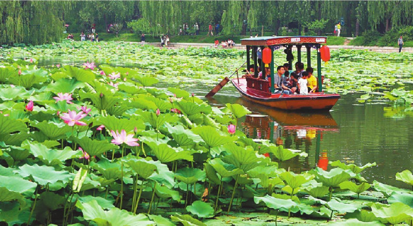 沈阳仙子湖旅游度假区湖水清澈、荷叶成片,极具江南水乡风韵。