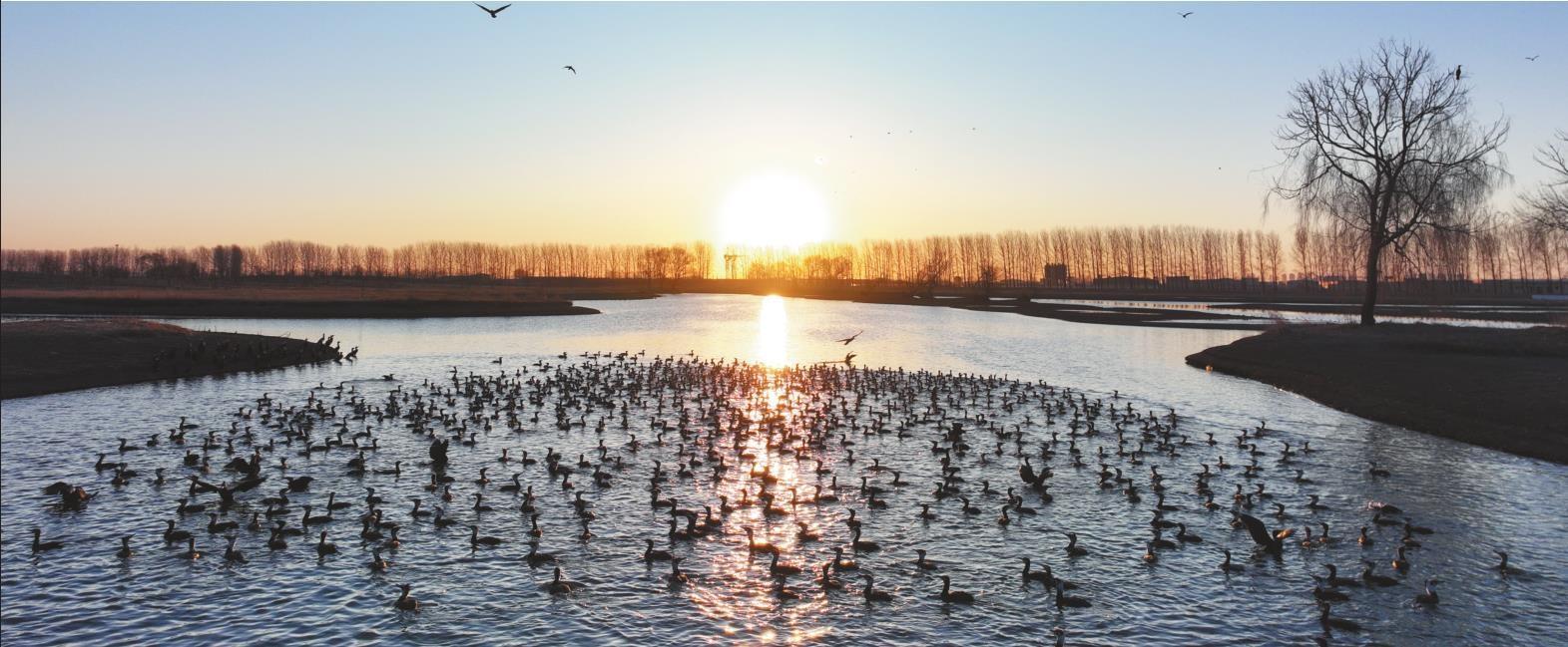 夕阳西下,成群的候鸟在沈阳溪溪湖湿地公园的湖面上游弋。