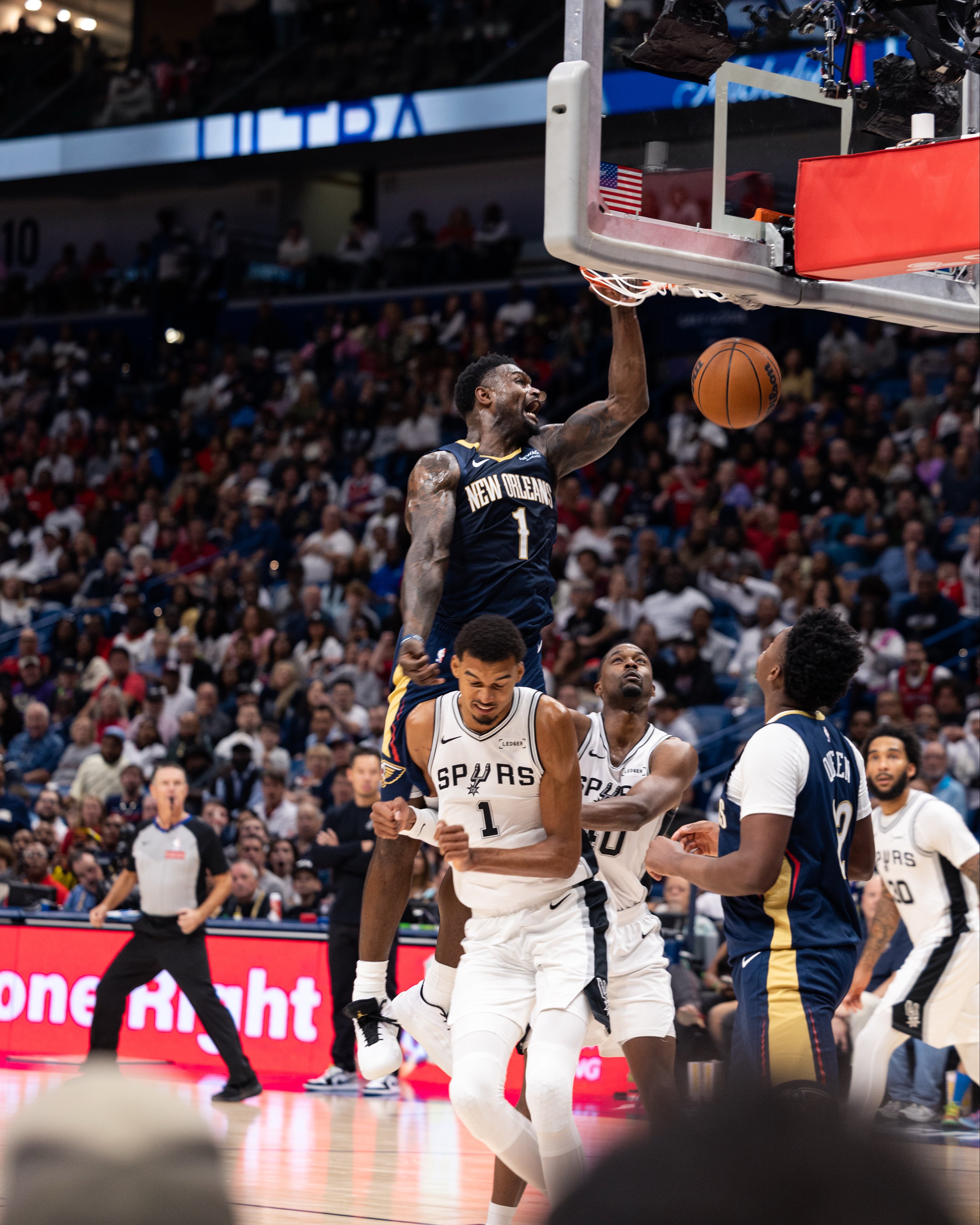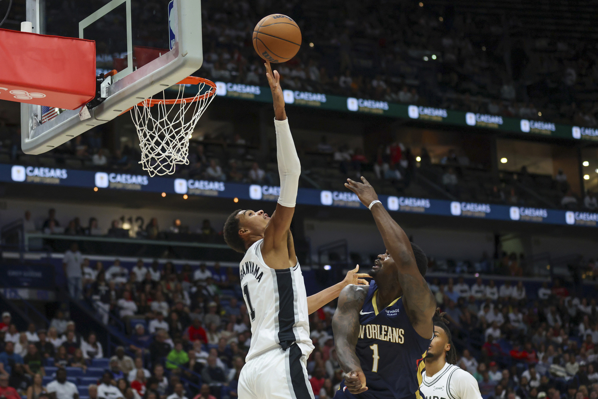 末节,锡安隔着文班上演炸裂补扣以及接连造犯规罚球得分,带队14-4反超8分;文班休息期间,马刺多点开花,哈珀和巴恩斯带队强势回应14-0攻势,一波流夺回主动权;决胜时刻文班轻松空接后错失三分以及失误,卡斯尔传球失误,鹈鹕一波8-0反超比分,锡安打进关键中投;生死时刻卡斯尔轰进三分,锡安强突遭文班犯规,两罚一中又扳平;最后11.4秒文班单挑锡安,强投错失绝杀,双方打进加时赛。